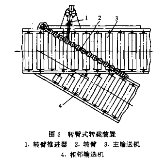 這是一種簡單的機(jī)械式轉(zhuǎn)載裝置配置形式如圖3所示,轉(zhuǎn)臂2可在主輸送機(jī)3上方轉(zhuǎn)動。當(dāng)處于轉(zhuǎn)載位置時(shí),可將滾筒輸送機(jī)上的物件阻擋,使之改變運(yùn)行方向進(jìn)入鄰近的分支輸送機(jī)4,也可使轉(zhuǎn)臂2讓開主輸?shù)鼨C(jī)上的通道,使被輸送物件繼續(xù)留在主輸送機(jī)上向前運(yùn)行。為減小轉(zhuǎn)臂阻擋物件所產(chǎn)生的摩擦阻力,一般在接觸側(cè)加裝導(dǎo)向輥?zhàn)愚D(zhuǎn)臂的操縱可以用手動,更多的是借助于氣缸或液壓缸進(jìn)行操縱。這種轉(zhuǎn)載裝置可以保證物件轉(zhuǎn)到鄰近輸送機(jī)后不改變運(yùn)行方向,這一點(diǎn)對于必須保持物件朝向的場合是非常重要的。這種轉(zhuǎn)載裝置只適宜于有較好導(dǎo)向側(cè)面的物件。